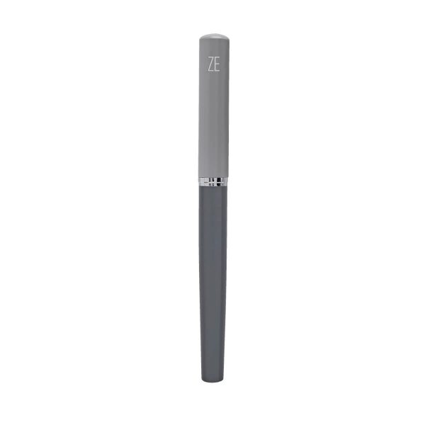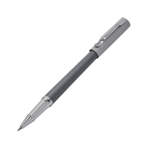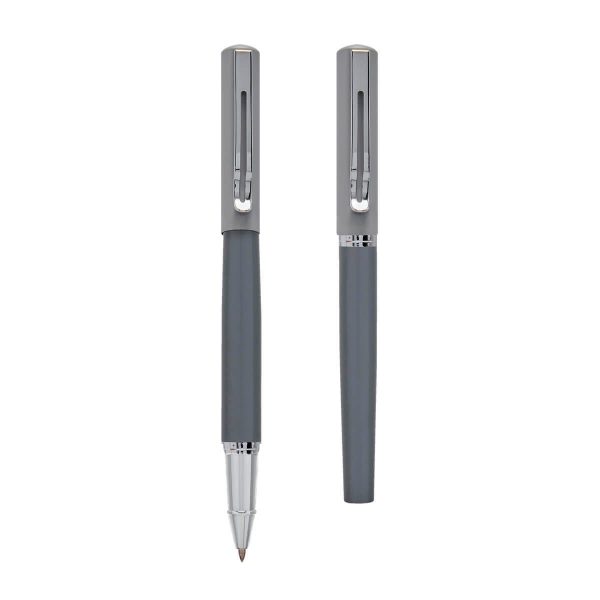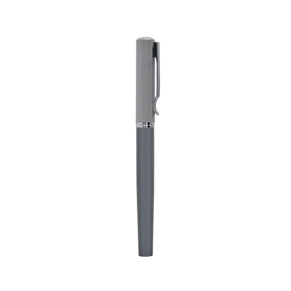 Bolígrafo metálico con tapón. Color en dos tonos de gris. Incluye estuche.
