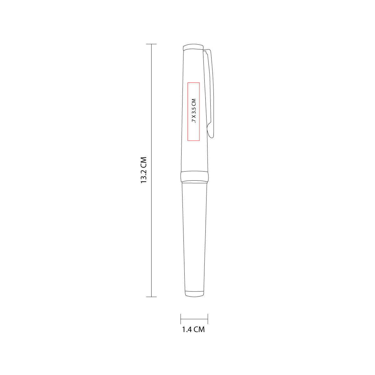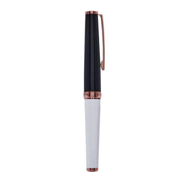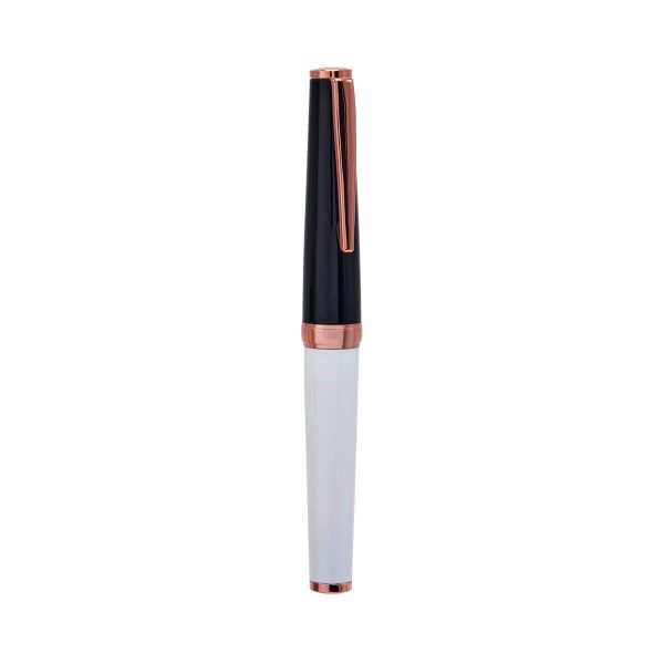 Bolígrafo metálico con tapón. Cuerpo en color blanco con punta dorada. Tapón en color negro y clip dorado. Incluye funda.