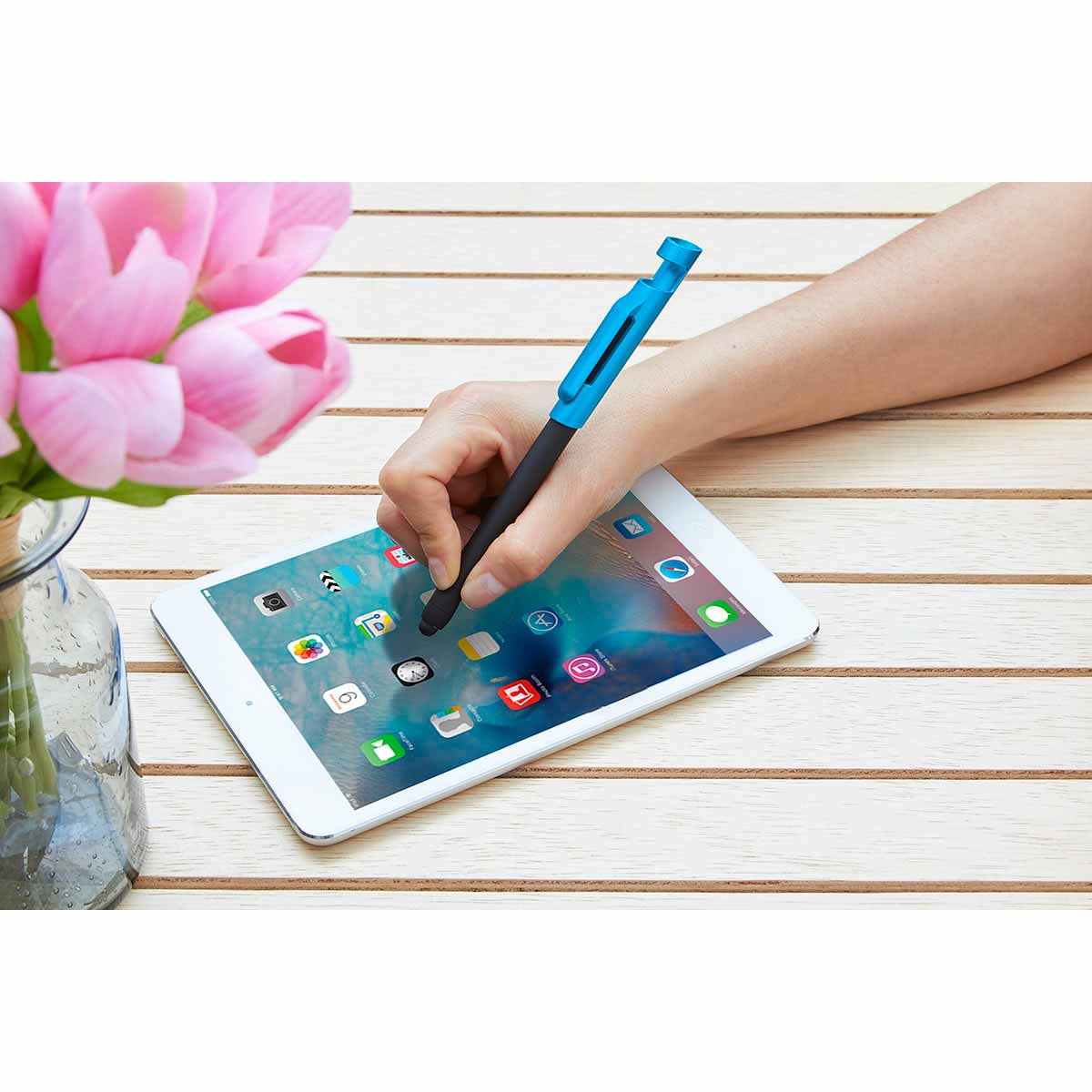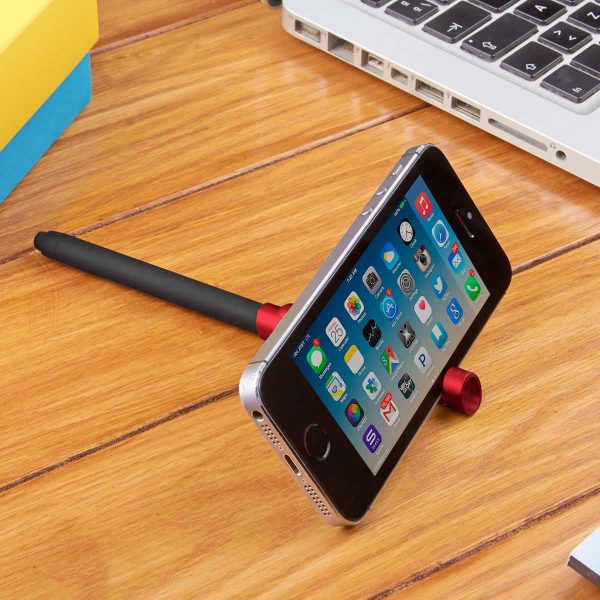 Bolígrafo con touch screen y base para smartphone. Terminado rubber.