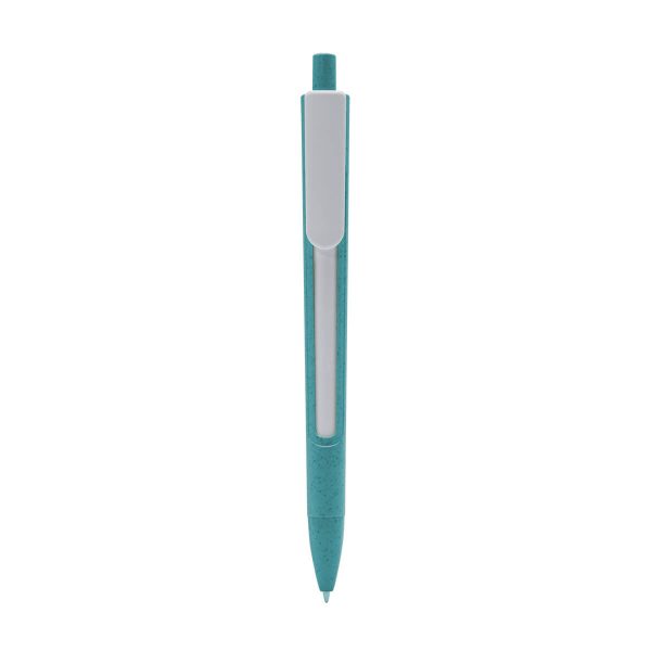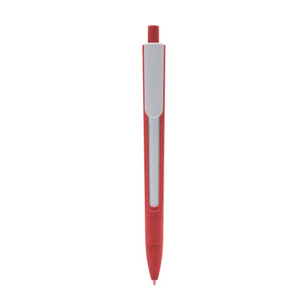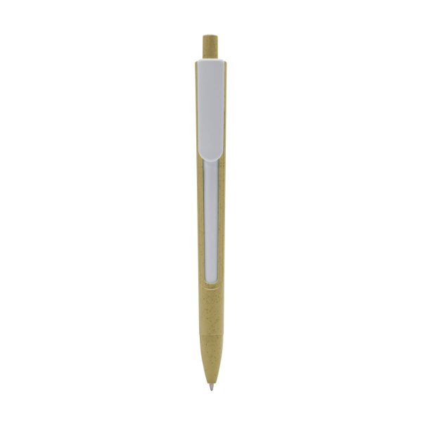 Bolígrafo con doble pared. Pared interior y clip de color blanco. Pared exterior con material de fibra de trigo. Mecanismo pulsador.