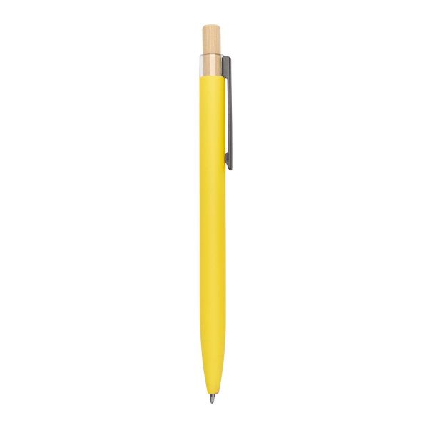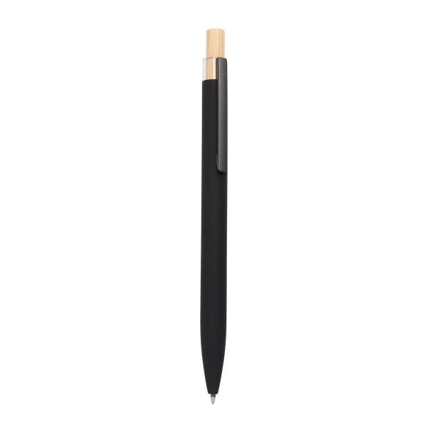 Bolígrafo con terminado tipo rubber. Mecanismo pulsador y botón de madera.