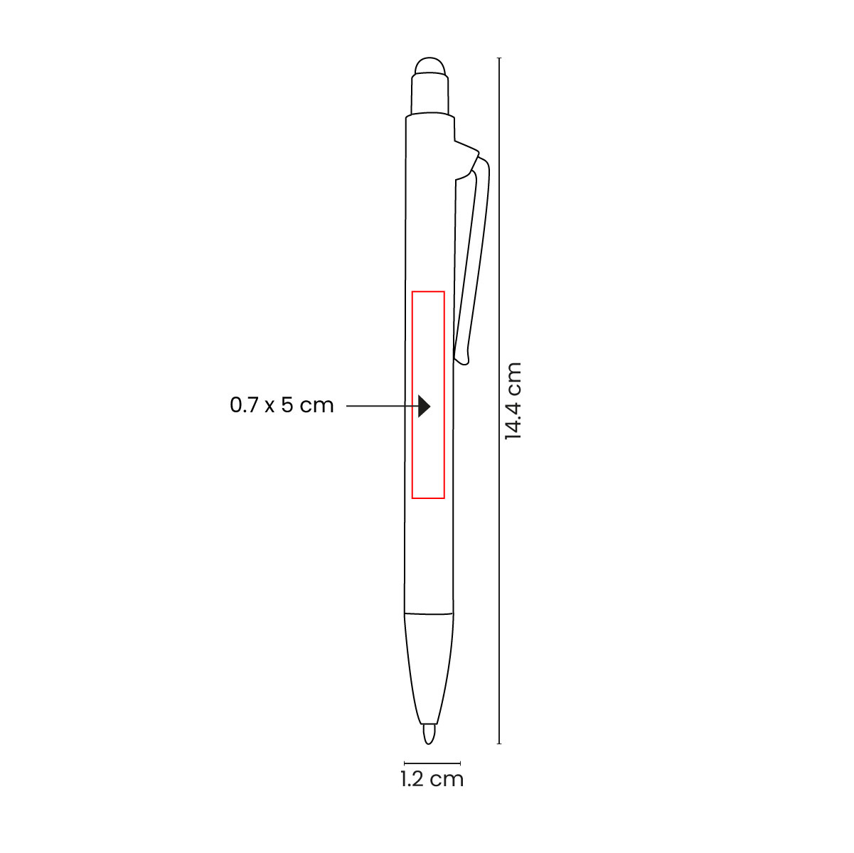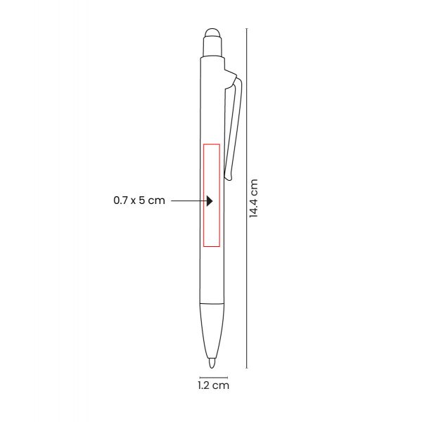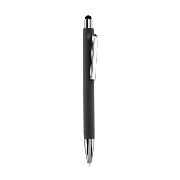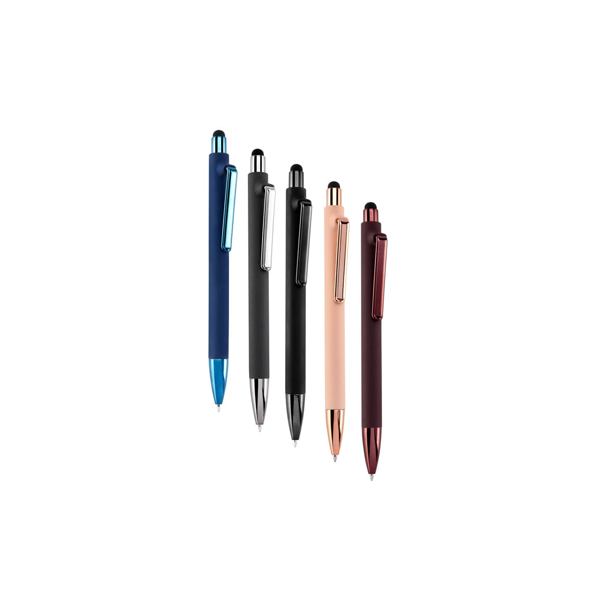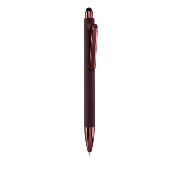 Bolígrafo con terminado tipo rubber y touch screen. Mecanismo pulsador. Botón, clip y punta en color metalizado al tono.