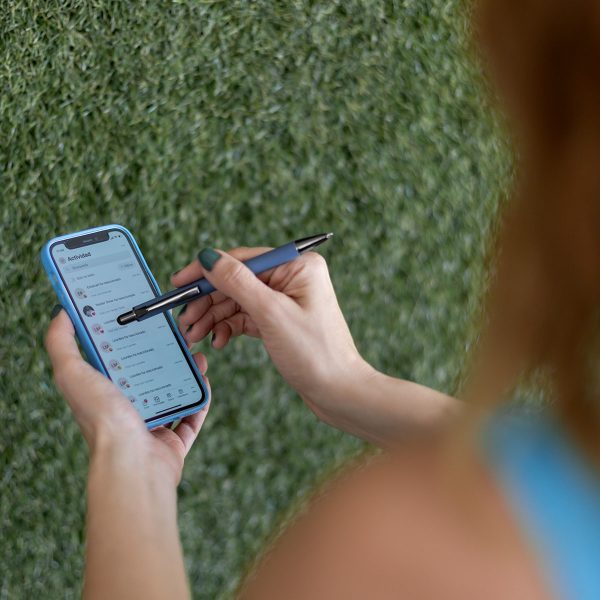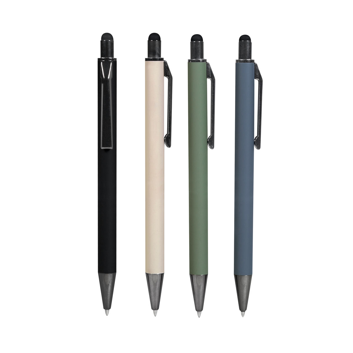 Bolígrafo con terminado tipo rubber y touch screen. Mecanismo pulsador. Clip y punta en color metalizado oscuro.