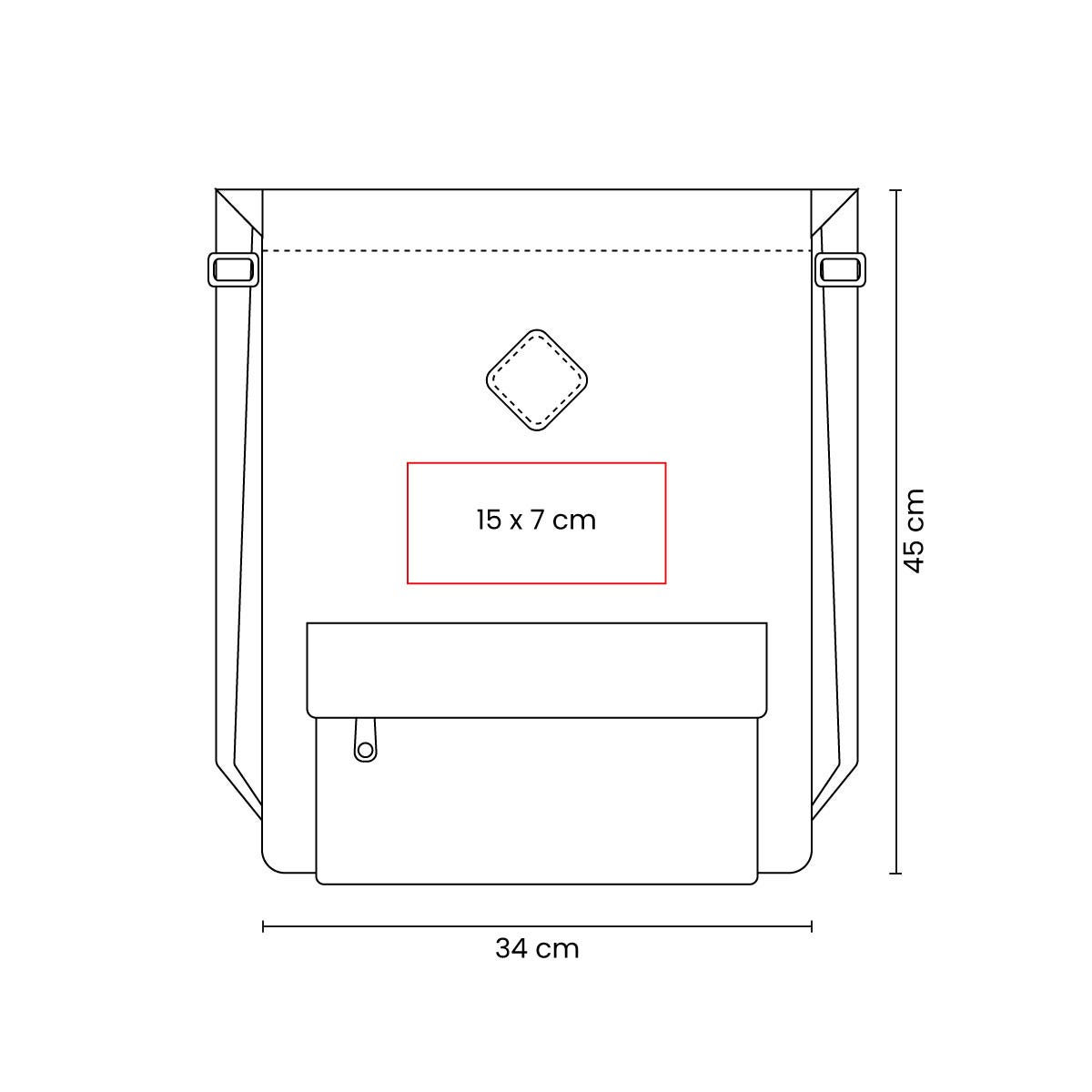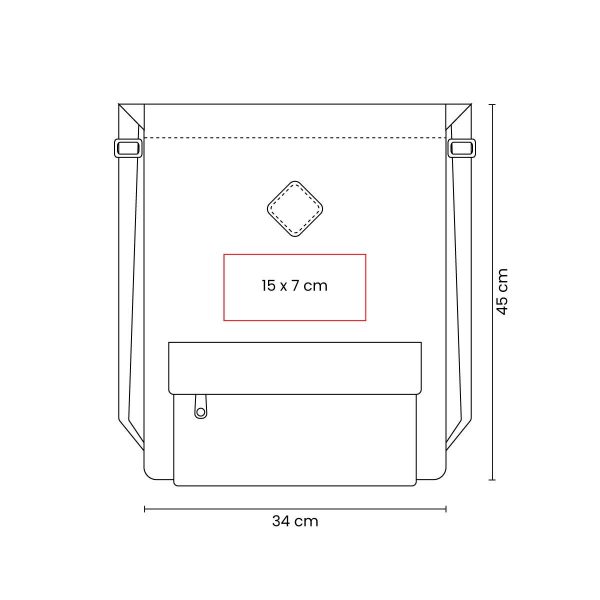 Bolsa-mochila con tirantes gruesos ajustables con broche de plástico y cerrado de jareta. Incluye bolsillo frontal con cierre.