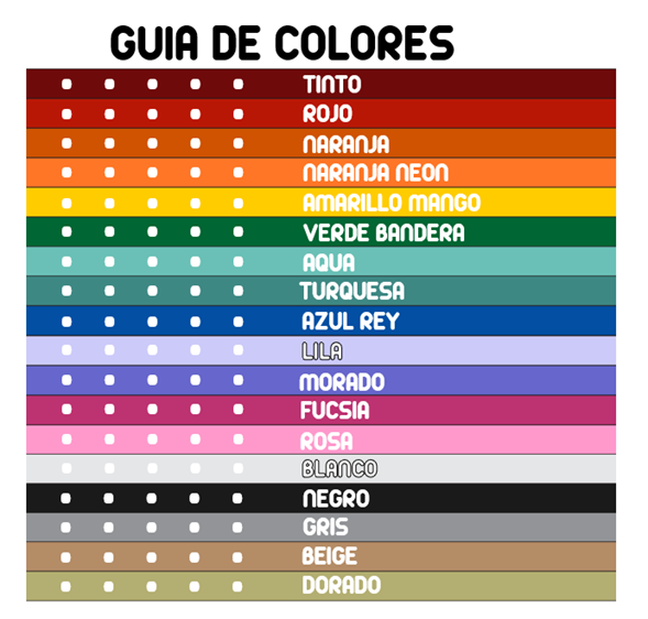 Tinto, Rojo, Naranja, Naranja Neón, Amarillo Mango, Verde Bandera, Turquesa, Aqqua, Azul Rey, Azul Cielo, Lila, Morado, Fucsia, Rosa, Blanco, Negro, Beige, Dorado y Gris