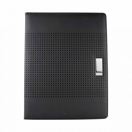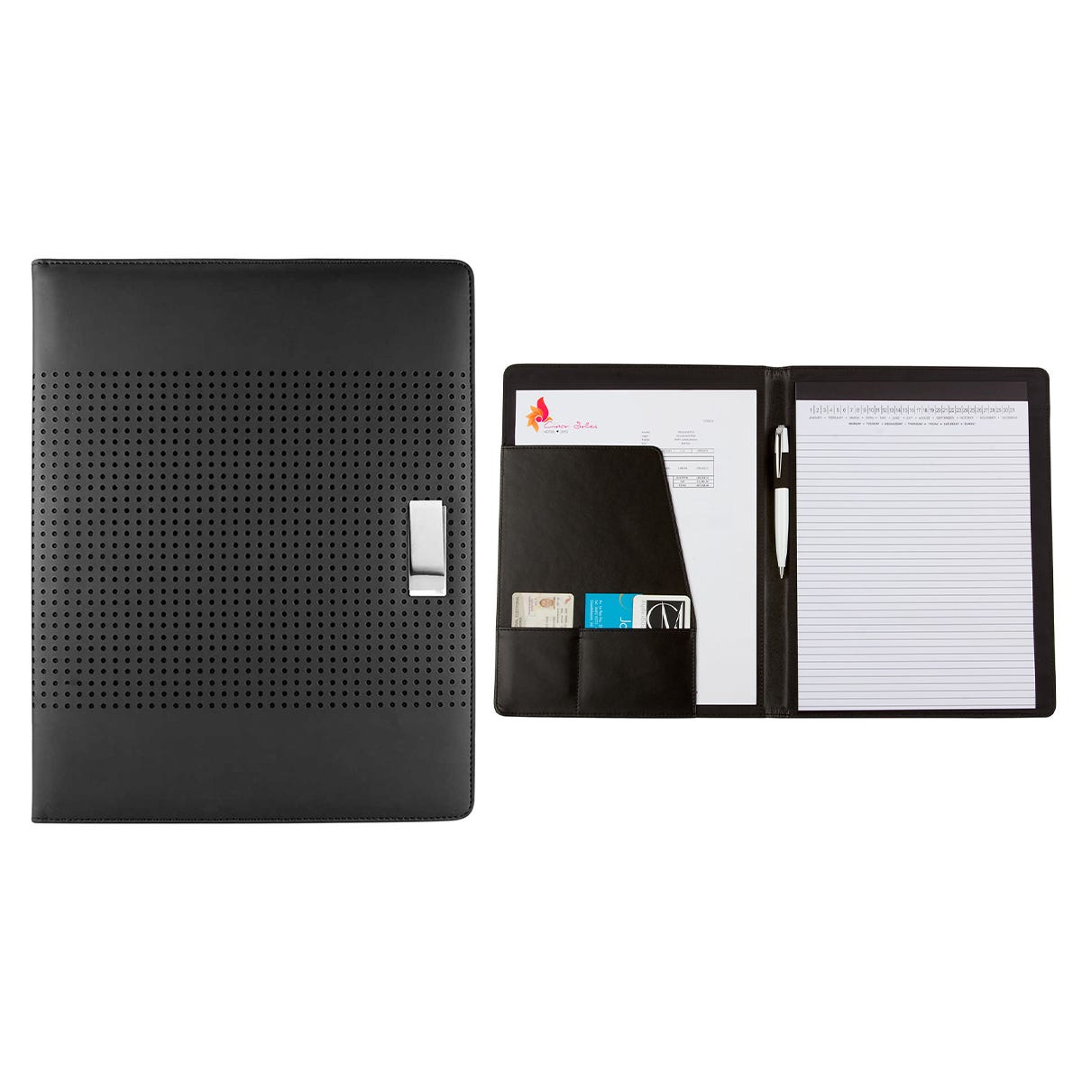 Incluye block de raya tamaño A4 con 20 hojas, elástico para bolígrafo y compartimento para tarjetas. No incluye bolígrafo.