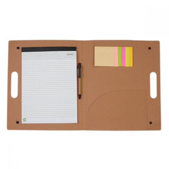 Carpeta ecológica. Incluye block de raya tamaño A4 con 20 hojas, bolígrafo y notas adheribles. Eco friendly
