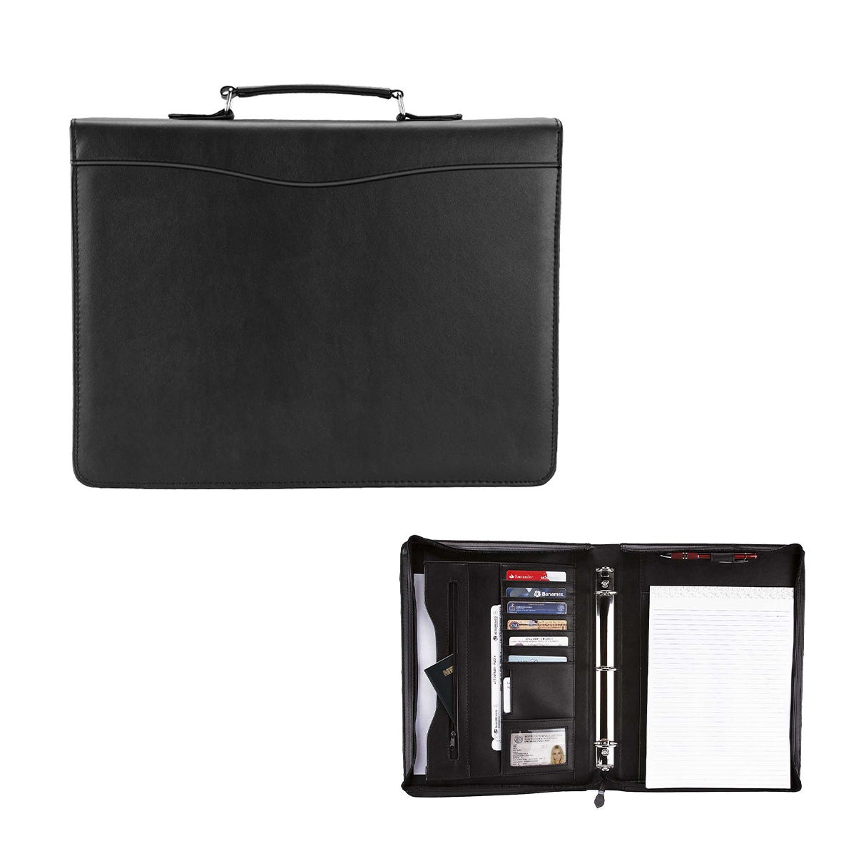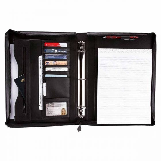 Carpeta portafolio con block de raya tamaño A4 con 20 hojas. Arillo de 1.25 pulgadas. No incluye bolígrafo.