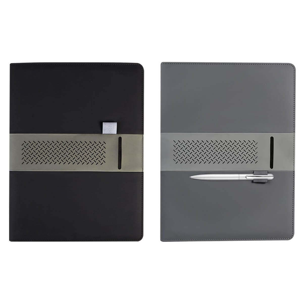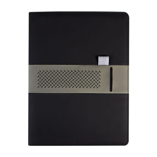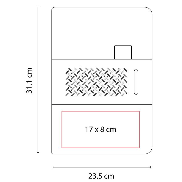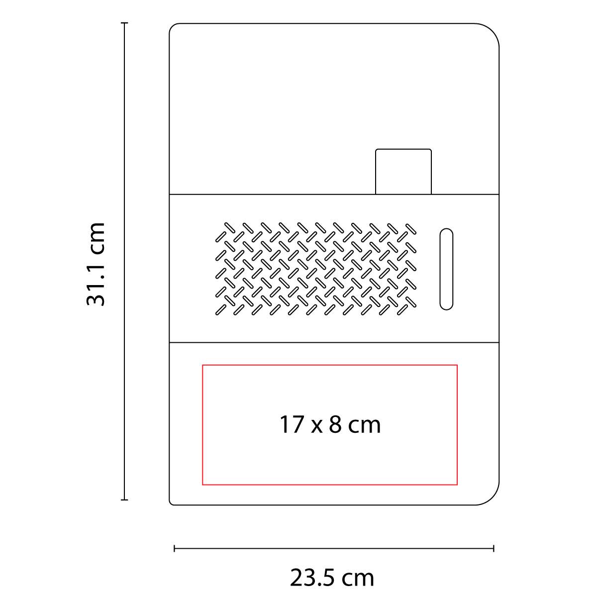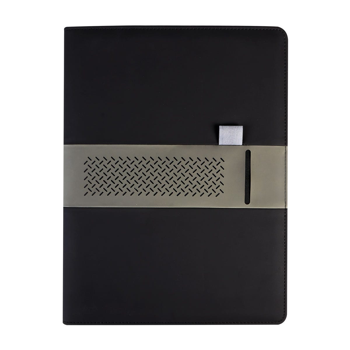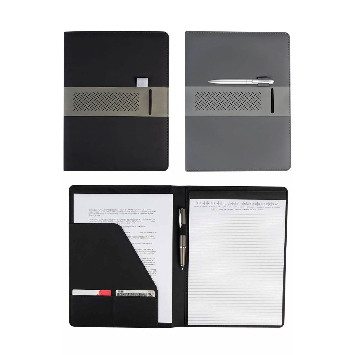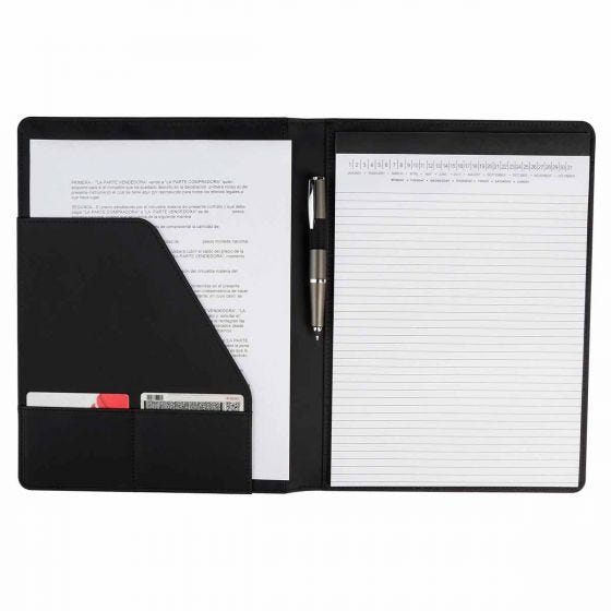 Incluye block de raya tamaño A4 con 20 hojas, elástico para bolígrafo, compartimento para documentos y tarjetas. No incluye bolígrafo.