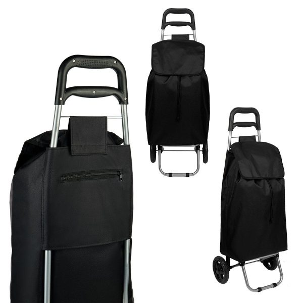 Bolsa para supermercado con jareta y solapa, bolsa posterior con cierre, estructura de metal, base para sostenerse, agarradera de plástico y llantas. Desmontable con velcro en la parte posterior.