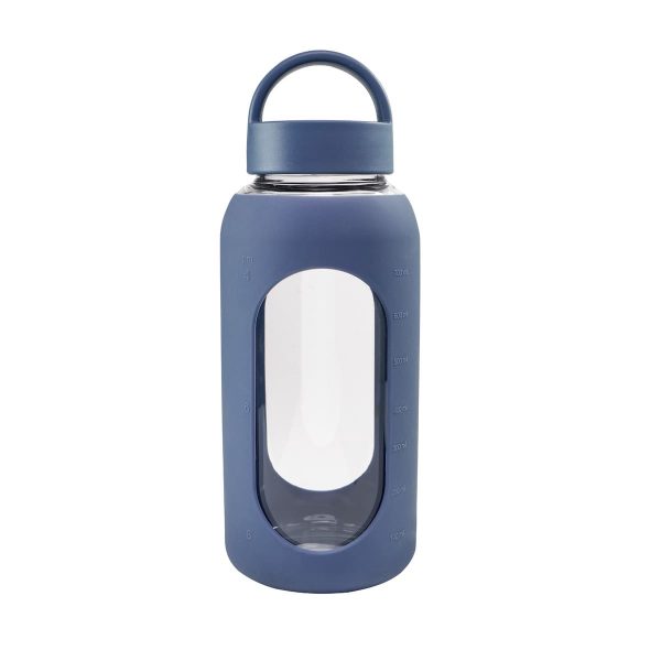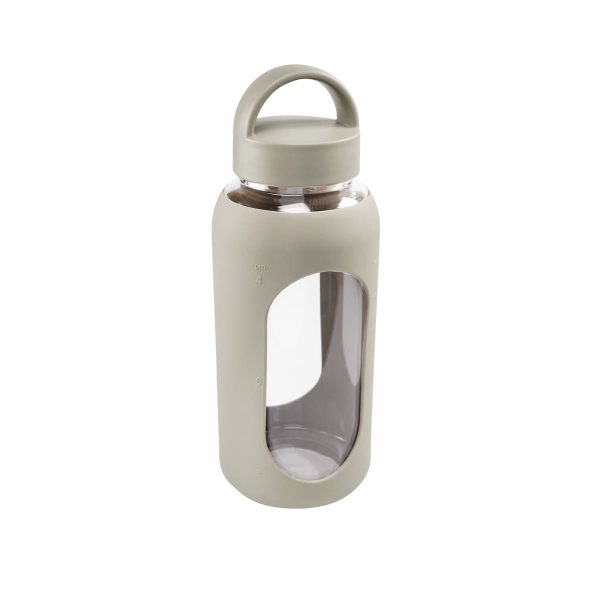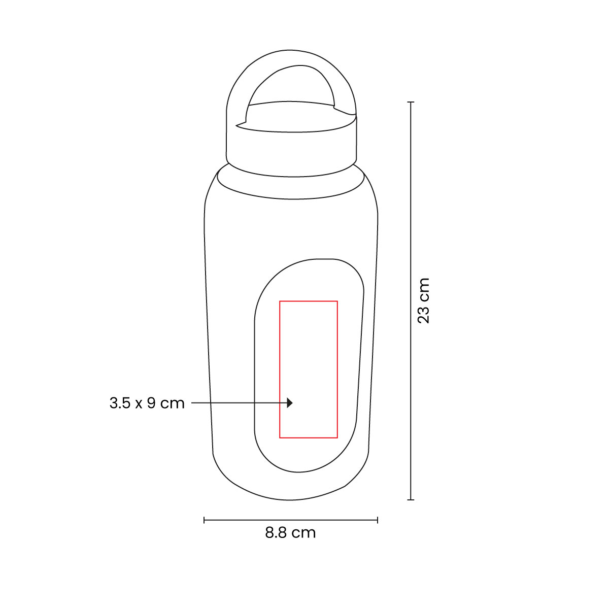 Cilindro de vidrio con manga de silicón graduada en ml. Tapa de plástico con sistema de rosca y asa. Vidrio resistente a bebidas calientes y frías. Incluye caja individual.