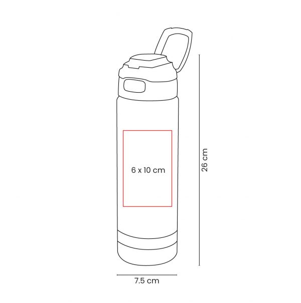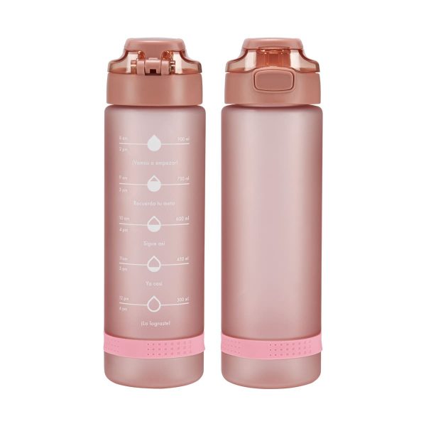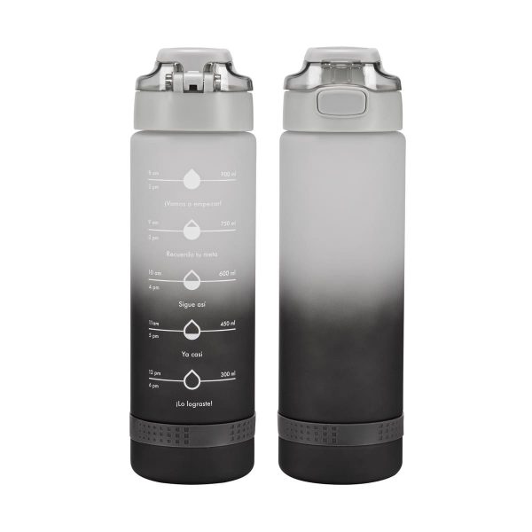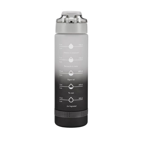 Tapa de plástico con cierre de rosca hermética y boquilla. Sobretapa push con botón y asa plegable. Cuerpo con terminado tipo rubber, suave al tacto. Cuenta con un detalle de silicón en la parte inferior. Incluye marcador de mililitros y horas lo que te permite medir fácilmente la cantidad de agua que bebes a lo largo del día y llevar un control de tu hidratación. Incluye caja individual.
