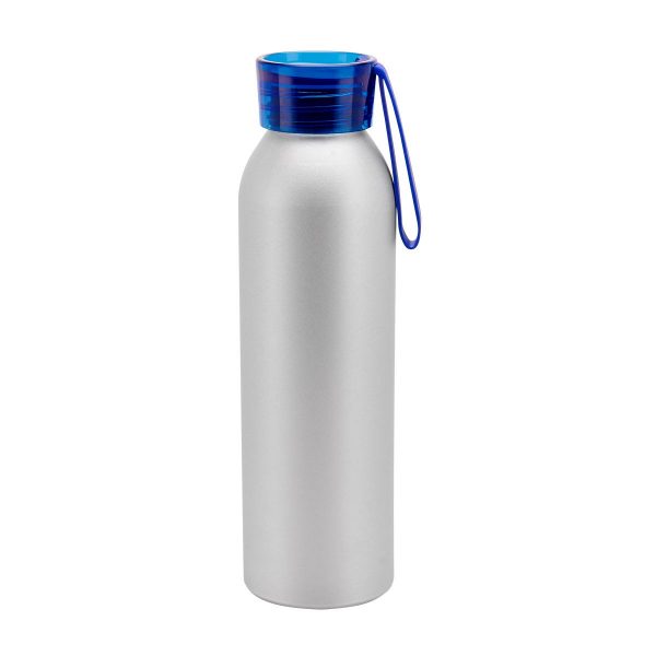 Cilindro de aluminio de una pared y tapa de plástico con cierre de rosca. Incluye asa silicón y caja individual.