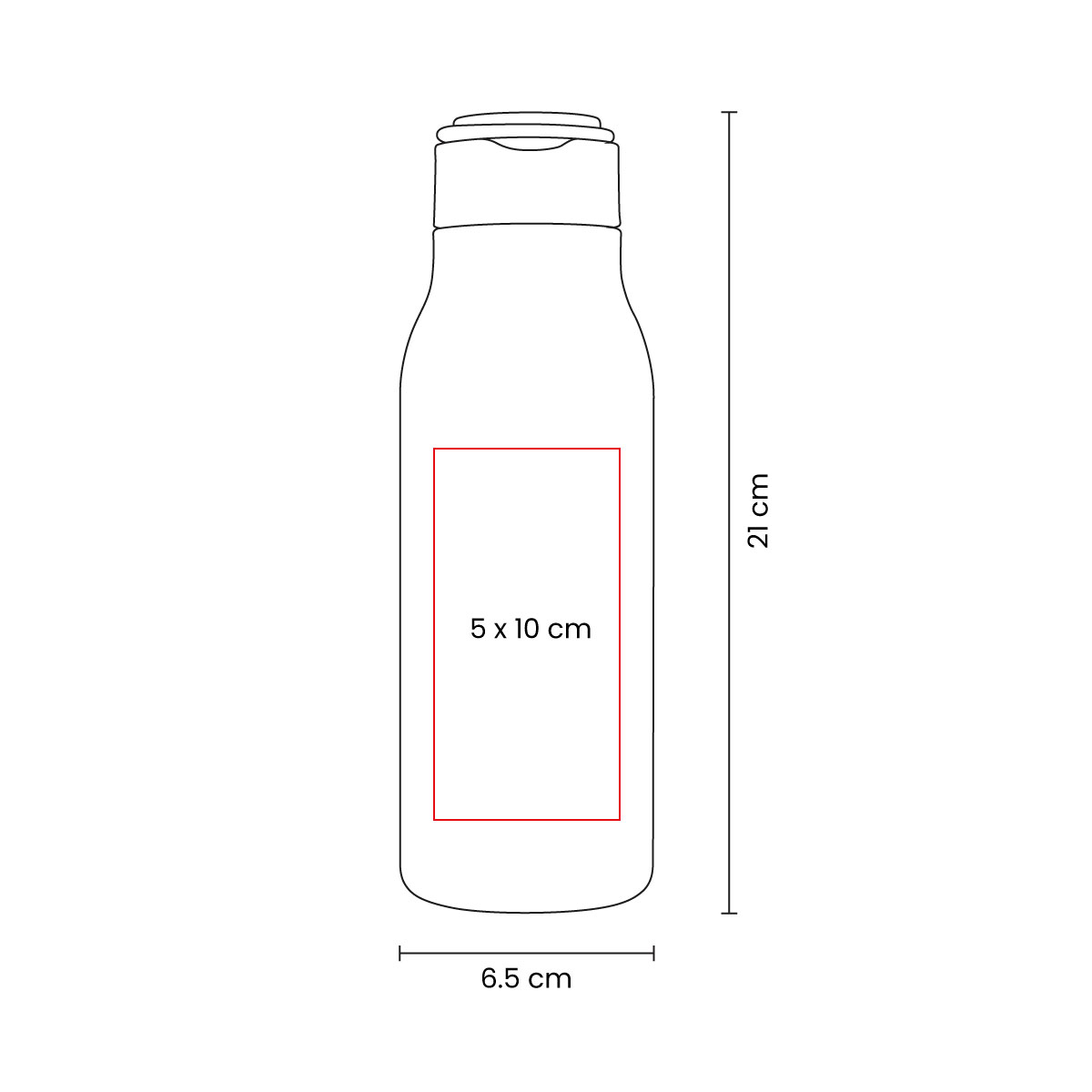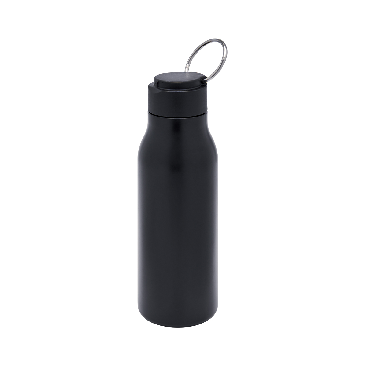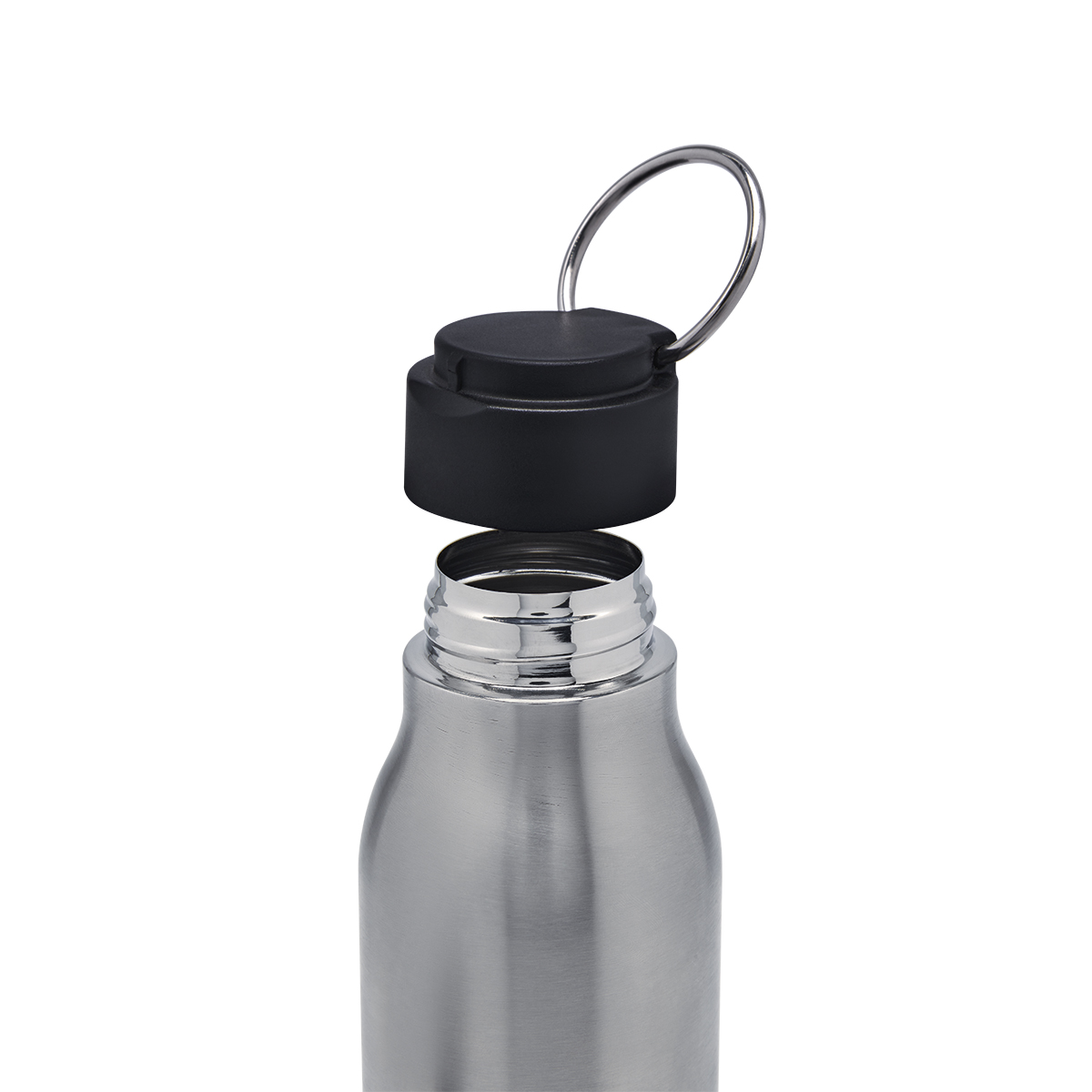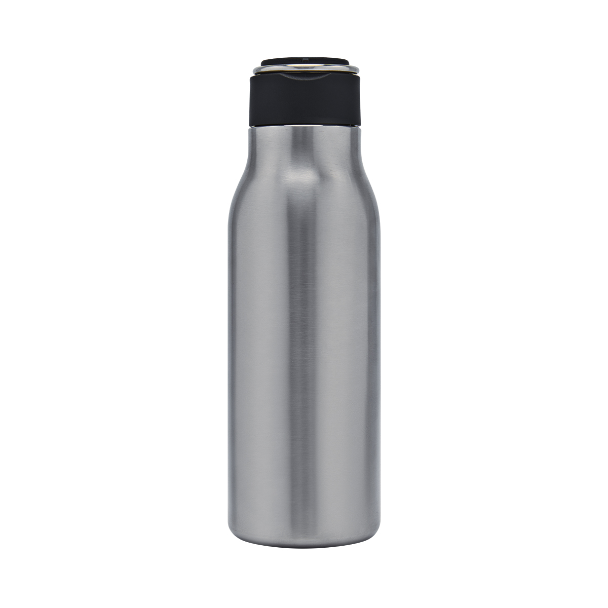 Cilindro metálico de una pared y tapa de plástico con cierre de rosca. Incluye aro metálico en la tapa que funciona como asa. Terminado mate. Incluye caja individual.