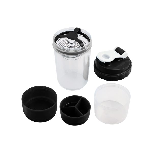 Cuenta con dos compartimentos especiales en la parte inferior y divisor de pastillas. Tapa con cierre de rosca, reductor y sobre tapa de presión. Incluye agitador y caja individual.