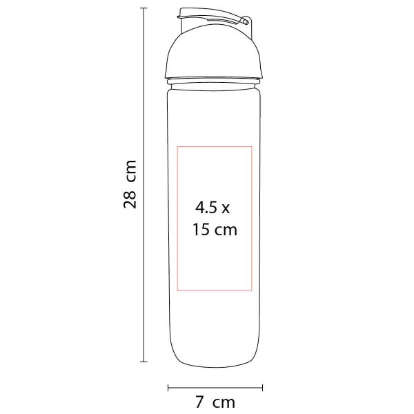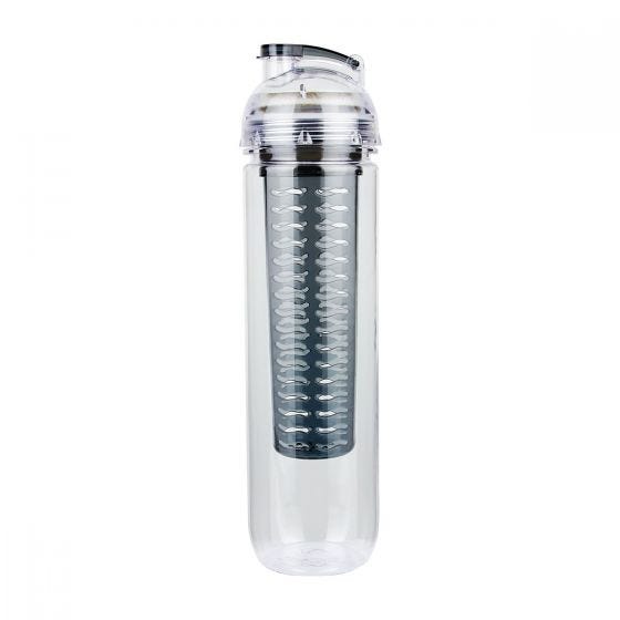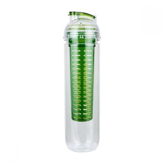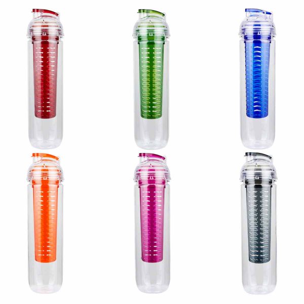 Cilindro con infusionador para frutas o bolsas de té. Tapa con sistema de rosca boquilla y sobre tapa que cierra a presión. Incluye caja individual.