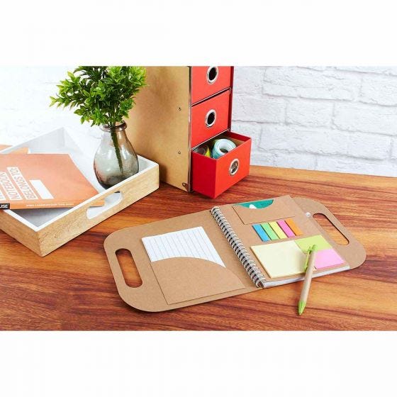 70 Hojas de raya. Incluye notas adheribles, bolígrafo ecológico, compartimento para tarjetas, sobre en contraportada y espiral metálico doble.