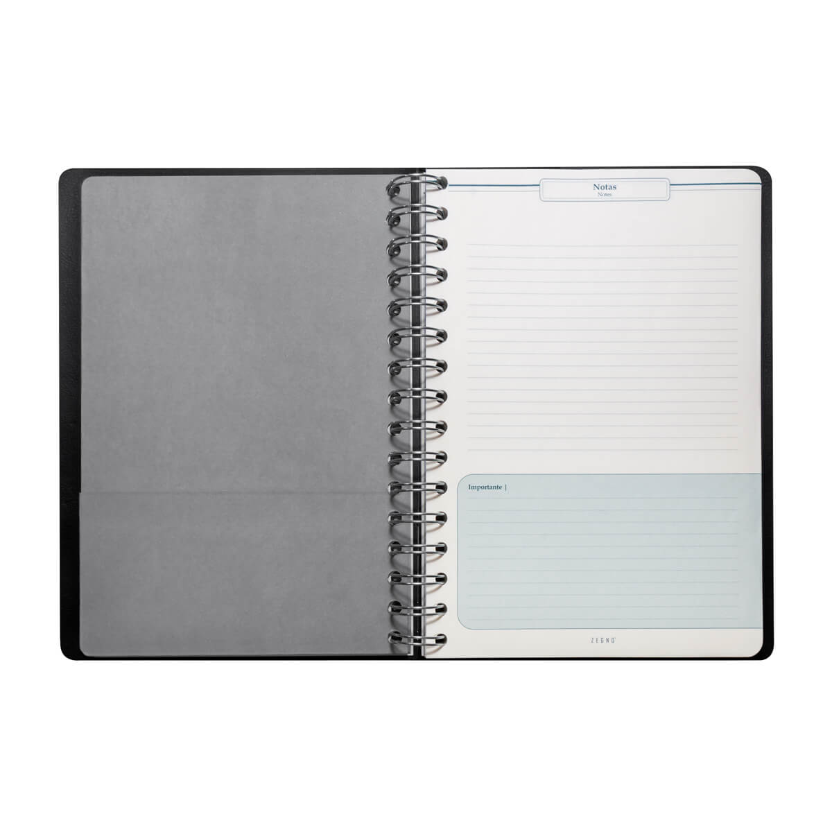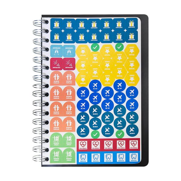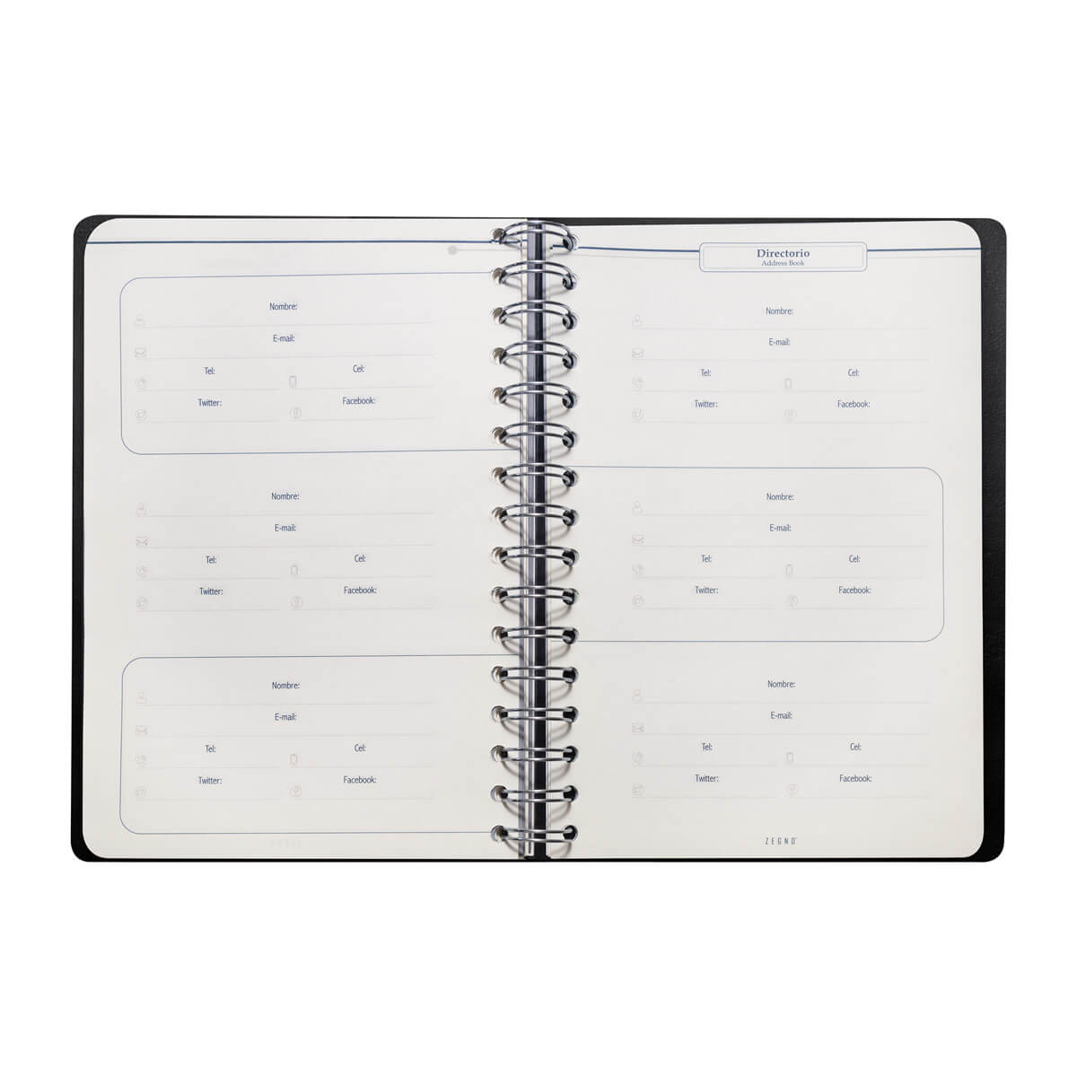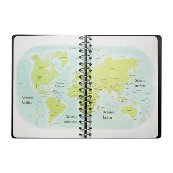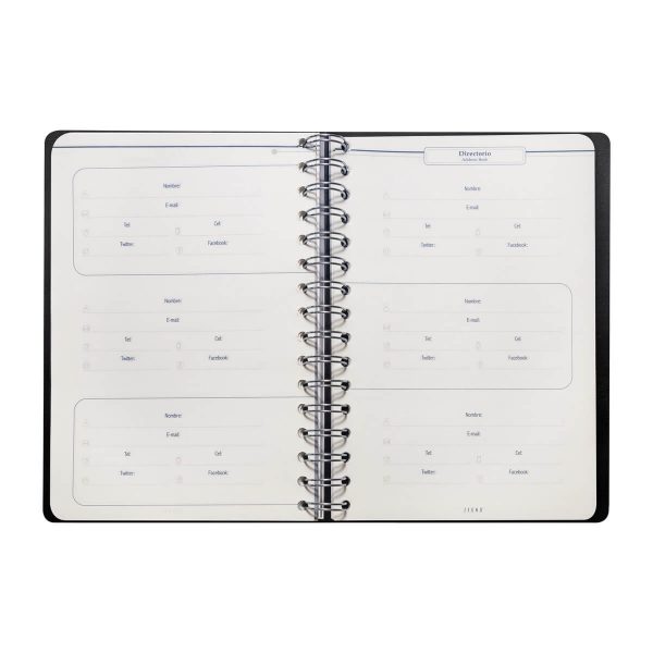 Libreta con espiral metálico de pasta flexible. Contiene 70 hojas, 3 separadores tipo folder, 4 hojas de directorio telefónico, 2 hojas con mapas y 2 hojas con stickers.