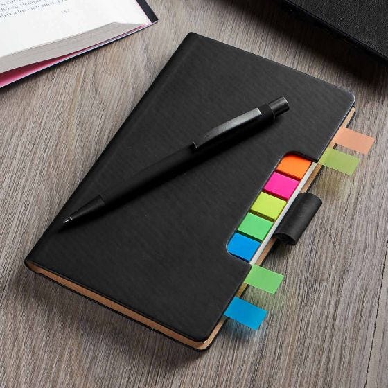 70 Hojas de raya. Incluye bolígrafo y notas adheribles de colores.