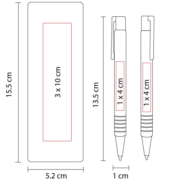 Área | 1 x 4 cm Bolígrafo / 3 x 10 cm Estuche |