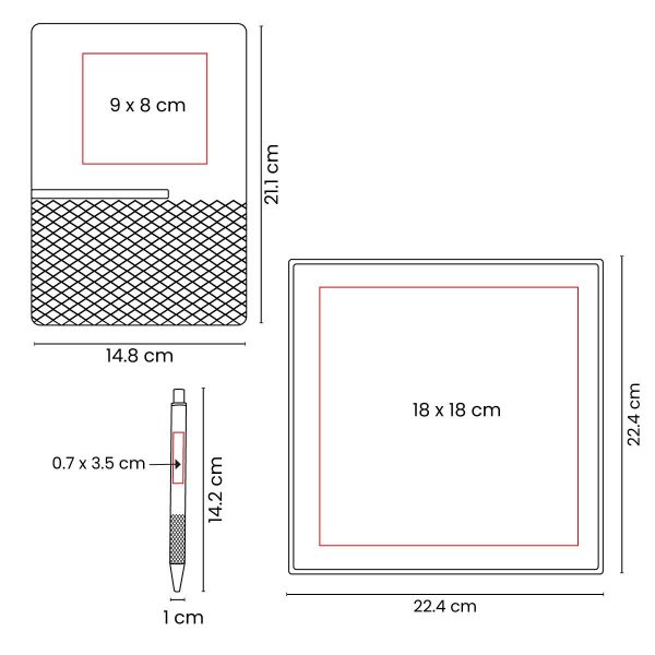 Área | 18 x 18 cm caja / 9 x 8 cm libreta / 0.7 x 3.5 cm bolígrafo |
