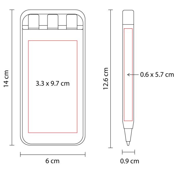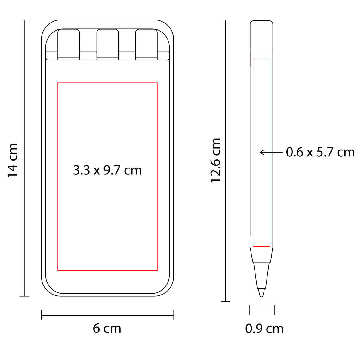 Área | 0.6 x 5.7 cm Bolígrafo / 3.3 x 9.7 cm Estuche |