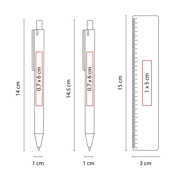 Medida 1 x 14 cm Bolígrafo / 1 x 14.5 cm Lapicera / 3 x 15 cm Regla / 3 x 2 cm Borrador