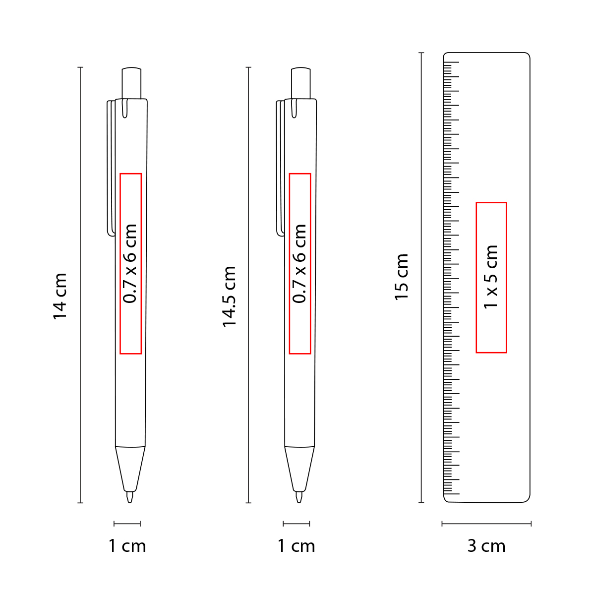Área 0.7 x 6 cm Bolígrafo / 0.7 x 6 cm Lapicera / 1 x 5 cm Regla