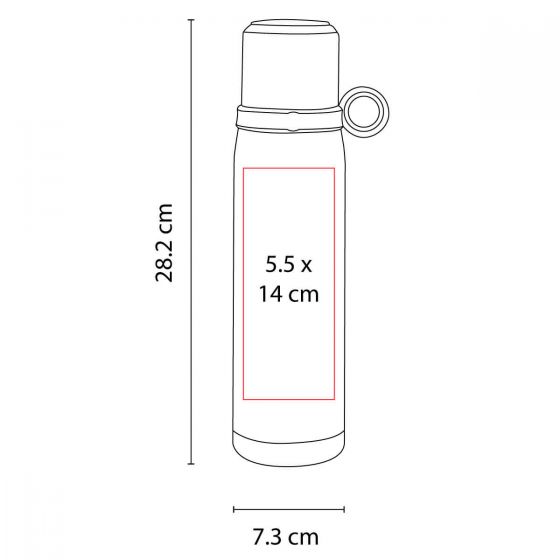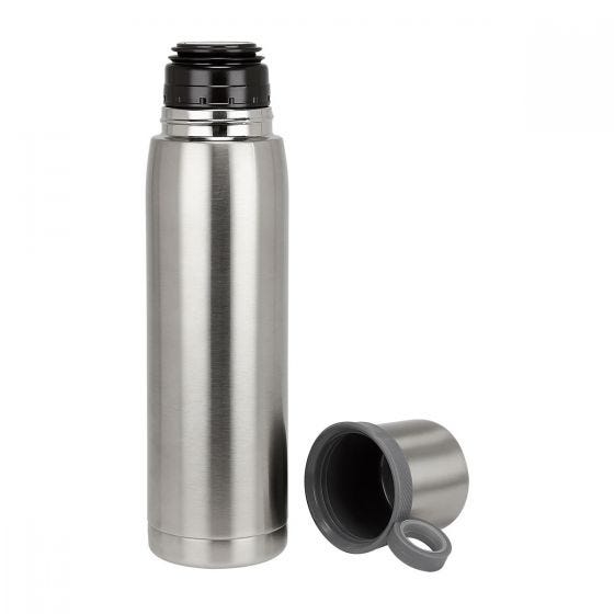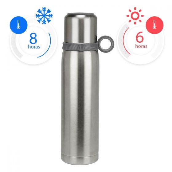 Doble pared. Cerrado al vacío. Pared interna y externa acero inoxidable. Incluye taza con agarradera y válvula de seguridad.