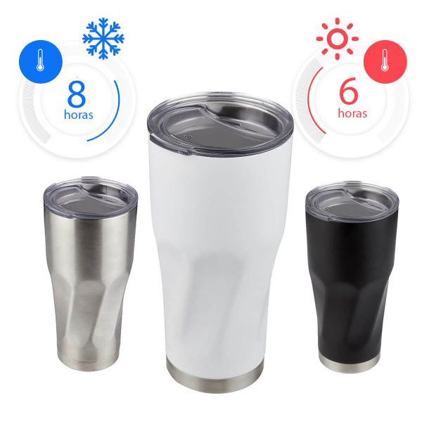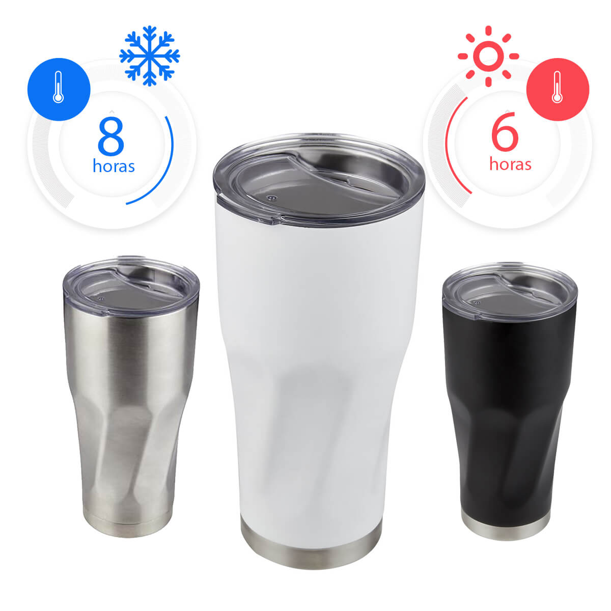 Doble pared. Cerrado al vacío. Pared interna y externa acero inoxidable. Tapa de plástico con ranura. Mantiene temperatura caliente 6 hrs y temperatura fría 8 hrs aproximadamente. Incluye caja individual.
