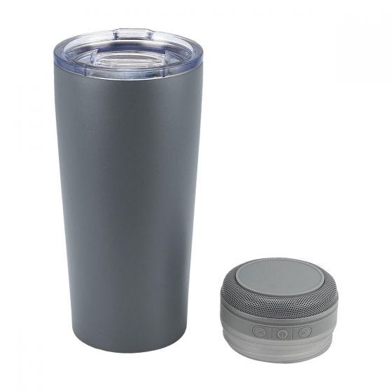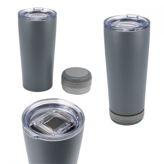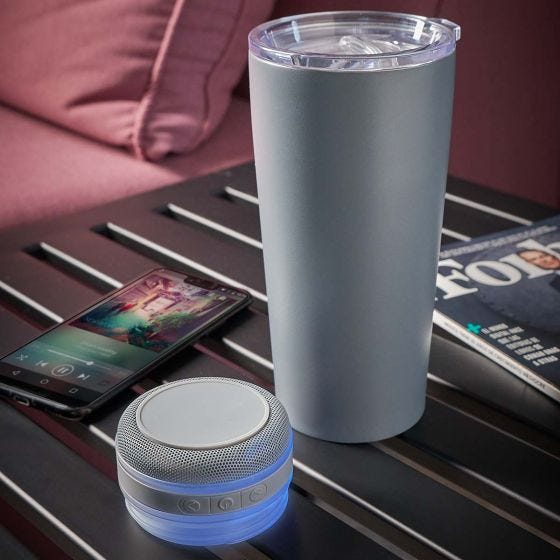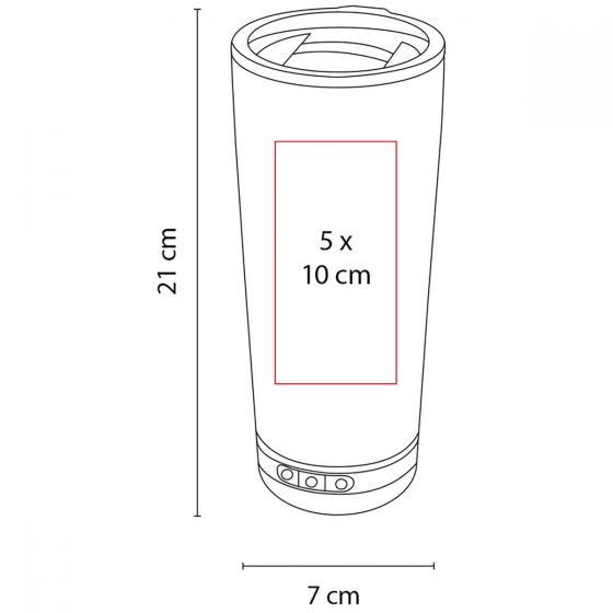 Doble pared. Cerrado al vacío. Pared interna y externa acero inoxidable. Incluye bocina bluetooth, controles de volumen y reproducción de audio. Incluye cable USB y batería recargable. Bocina removible y con efecto de luces.