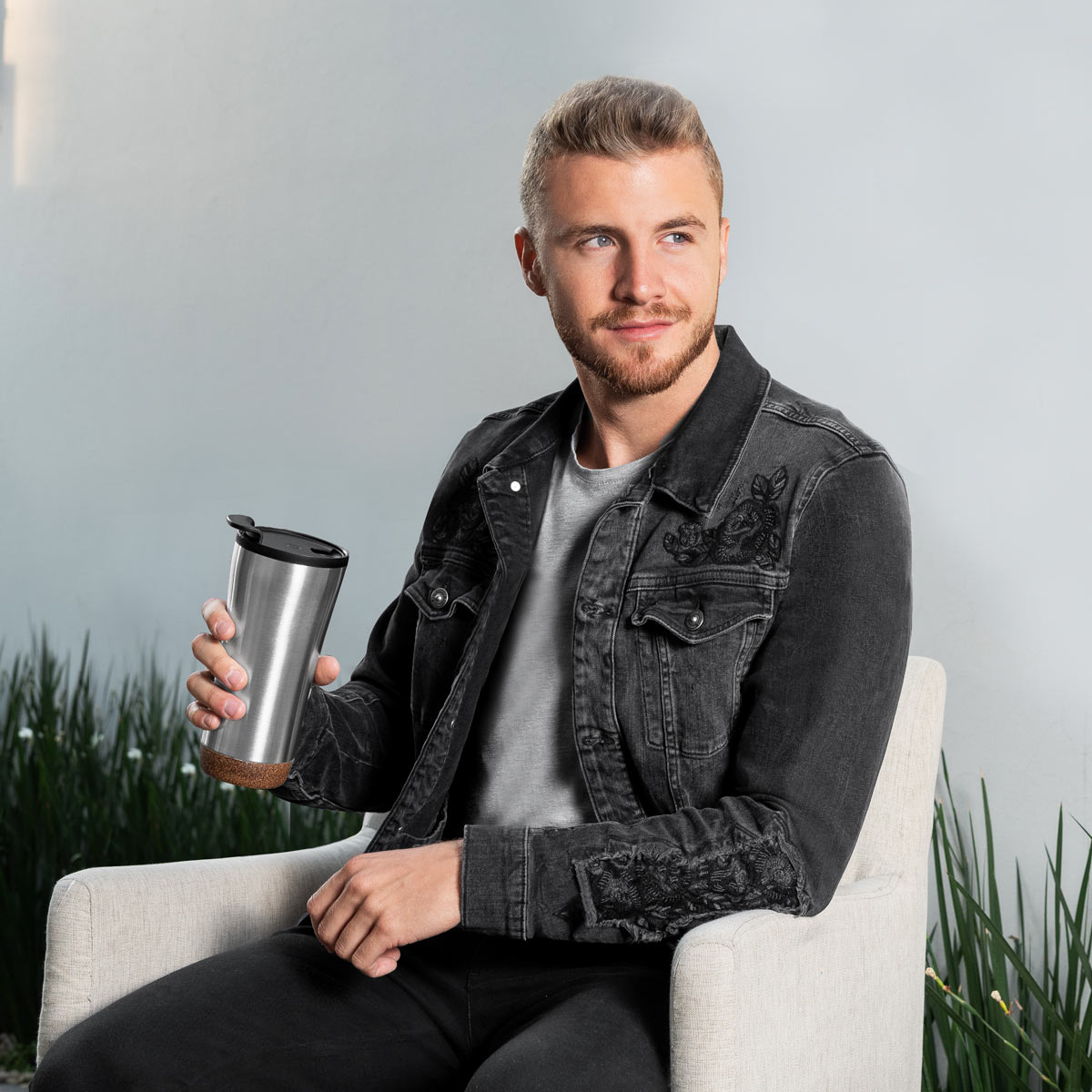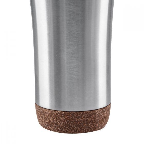 Doble pared. Pared interior plástico, pared exterior acero inoxidable. Base de corcho. Tapa en dos posiciones. No usar en microondas ni lavavajillas.