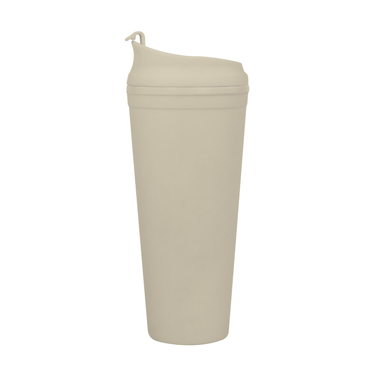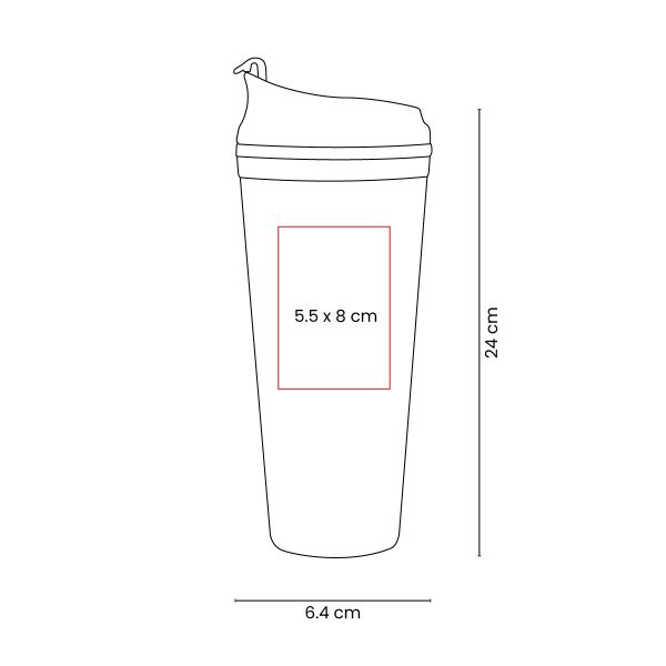 Doble pared. Pared interna y externa de plástico. Tapa de plástico con sistema de rosca. Sobre tapa con sistema de push. Incluye popote. Cuerpo y tapa con terminado tipo rubber. Caja individual incluida.