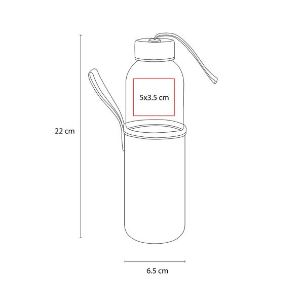 Cilindro de vidrio con tapa metálica de rosca con jareta de tela y funda removible de neopreno con asa que no permite transferir calor de las manos o del ambiente a la bebida. Incluye caja individual.