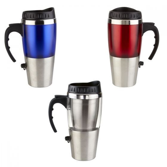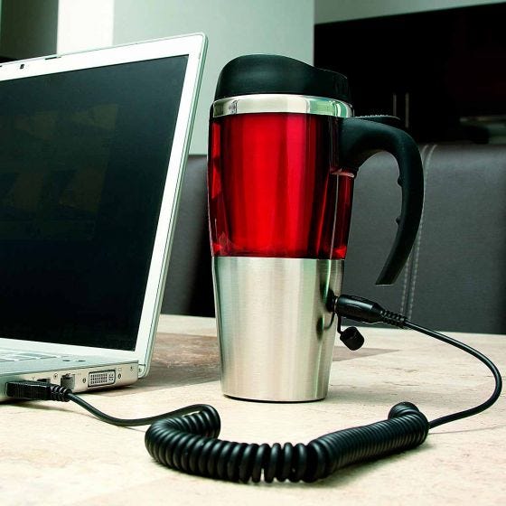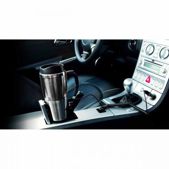 Doble pared. Pared interior acero inoxidable, pared exterior plástico. Fuente corriente, adaptador para automóvil y USB, mantiene la temperatura de las bebidas, no calienta. Incluye válvula de seguridad.
