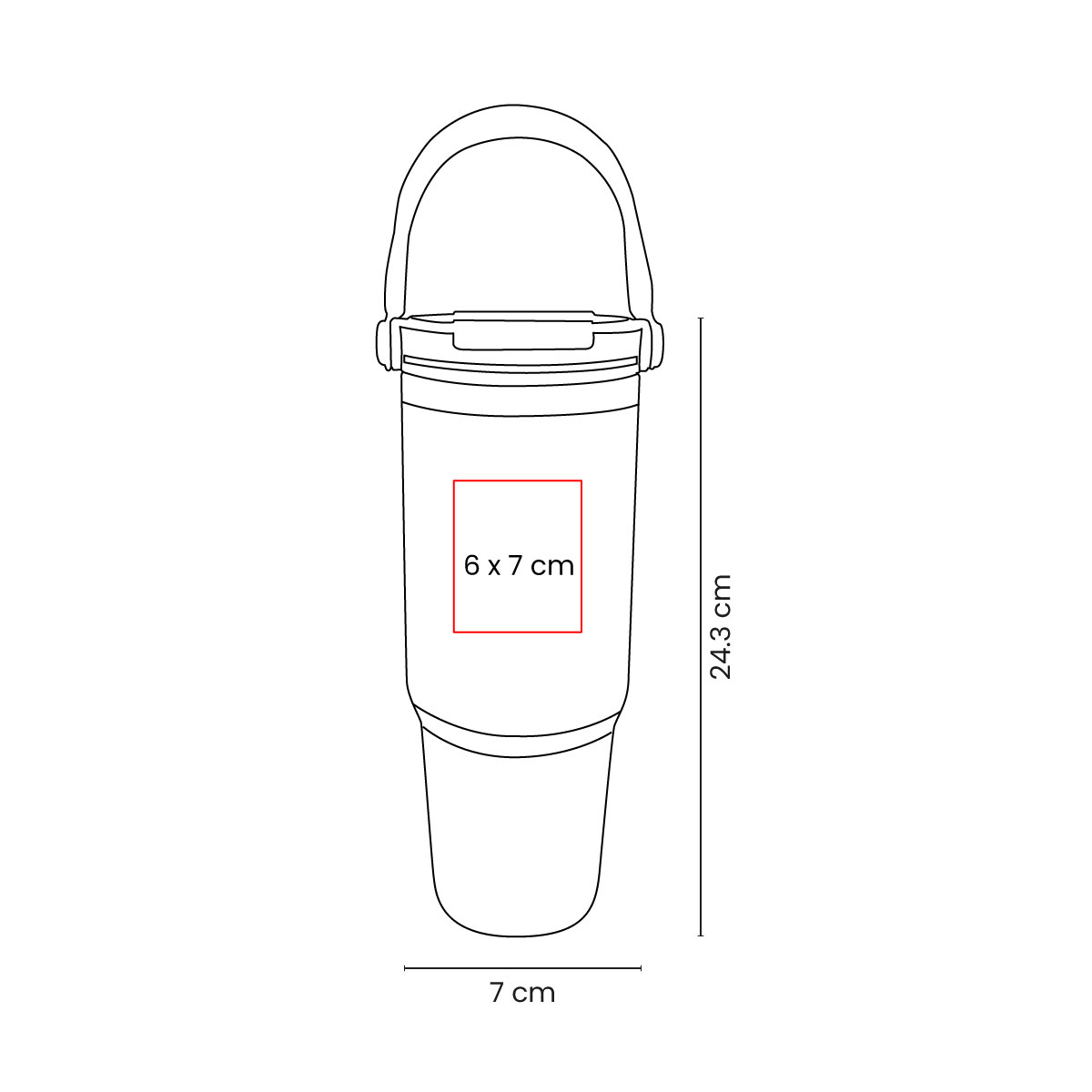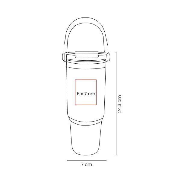 Doble pared. Cerrado al vacío. Pared interna y externa de acero inoxidable. Tapa con asa plegable de plástico con cierre de rosca. Sobretapa de push y popote retráctil. Mantiene temperatura caliente 6 hrs y temperatura fría 8 hrs aproximadamente. Incluye caja individual.