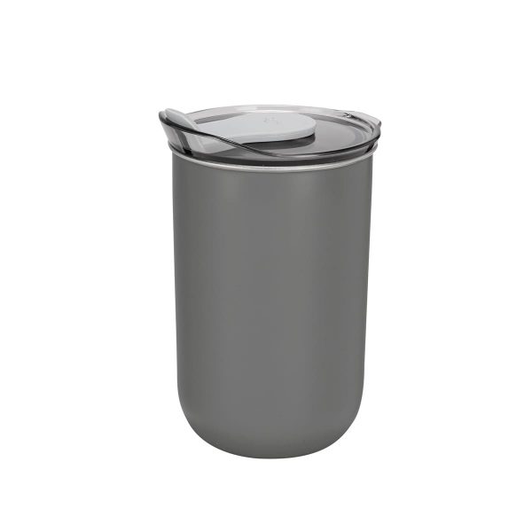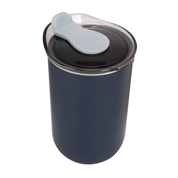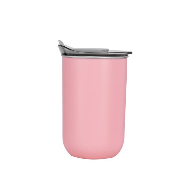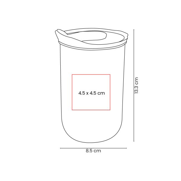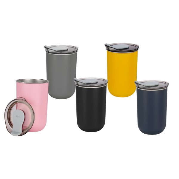 Doble pared. Pared interna de acero inoxidable y externa de plástico. Tapa de plástico con sistema push y sobretapa de silicón movible. Incluye caja individual.