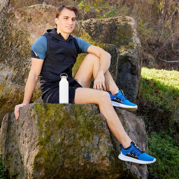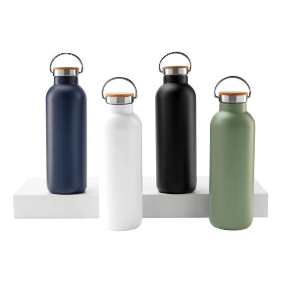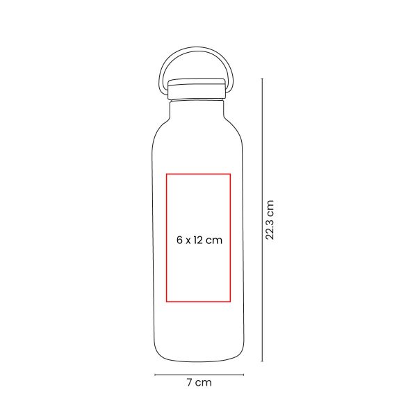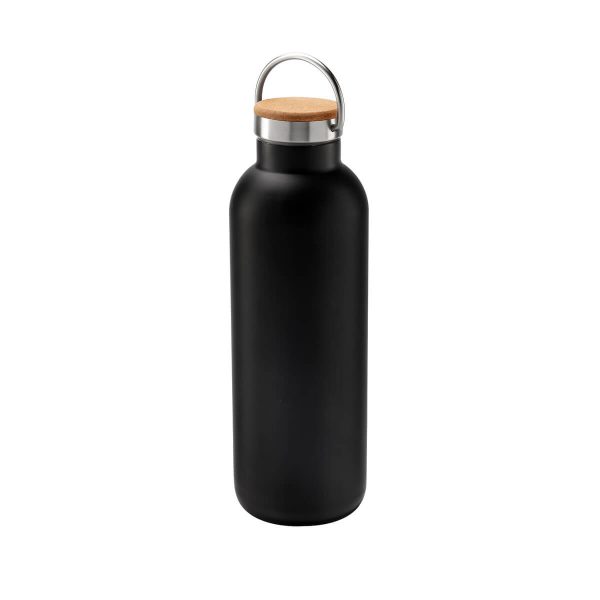 Doble pared. Cerrado al vacío. Pared interna y externa de acero inoxidable. Tapa con sistema de rosca de acero inoxidable con corcho y asa metálica. Mantiene temperatura caliente 6 hrs y temperatura fría 12 hrs. Incluye caja individual.