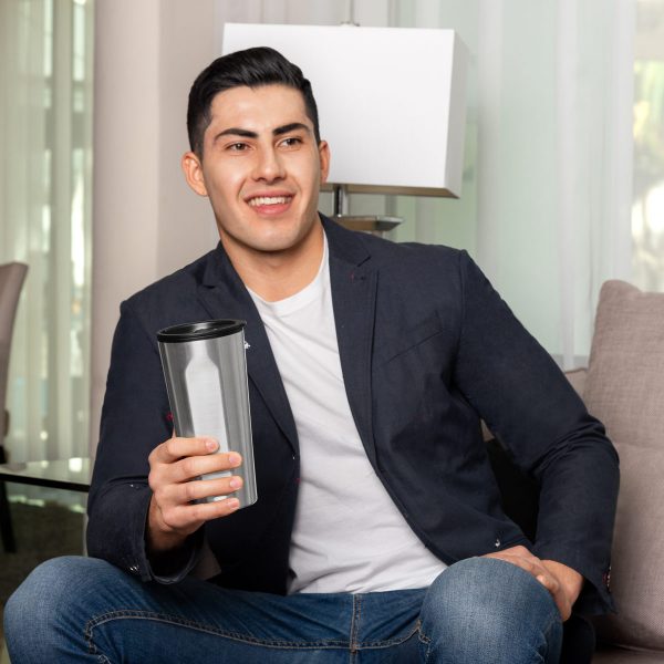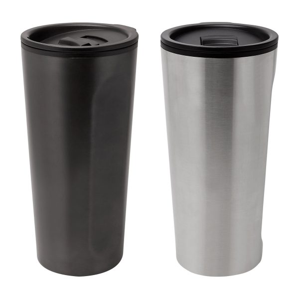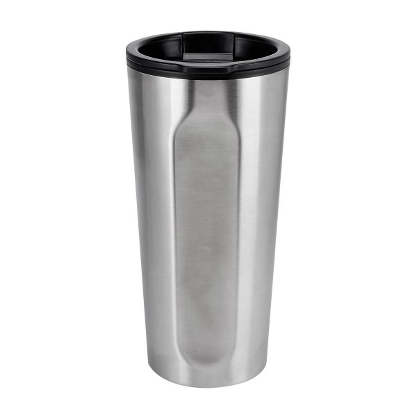 Doble pared. Pared interna plástico, pared externa acero inoxidable. Tapa de plástico con válvula de seguridad. Incluye caja individual.