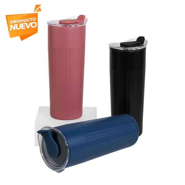 Doble pared. Pared interna de plástico, pared externa de acero inoxidable. Tapa de plástico con sistema de push. Sobre tapa de silicón movible. Incluye caja individual