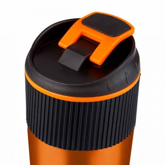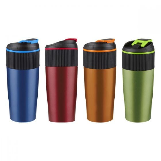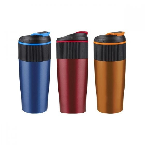 Doble pared. Pared interior plástico, pared exterior acero inoxidable. Incluye válvula de seguridad y banda de silicón.