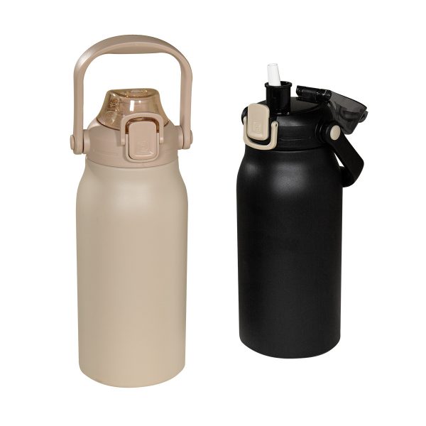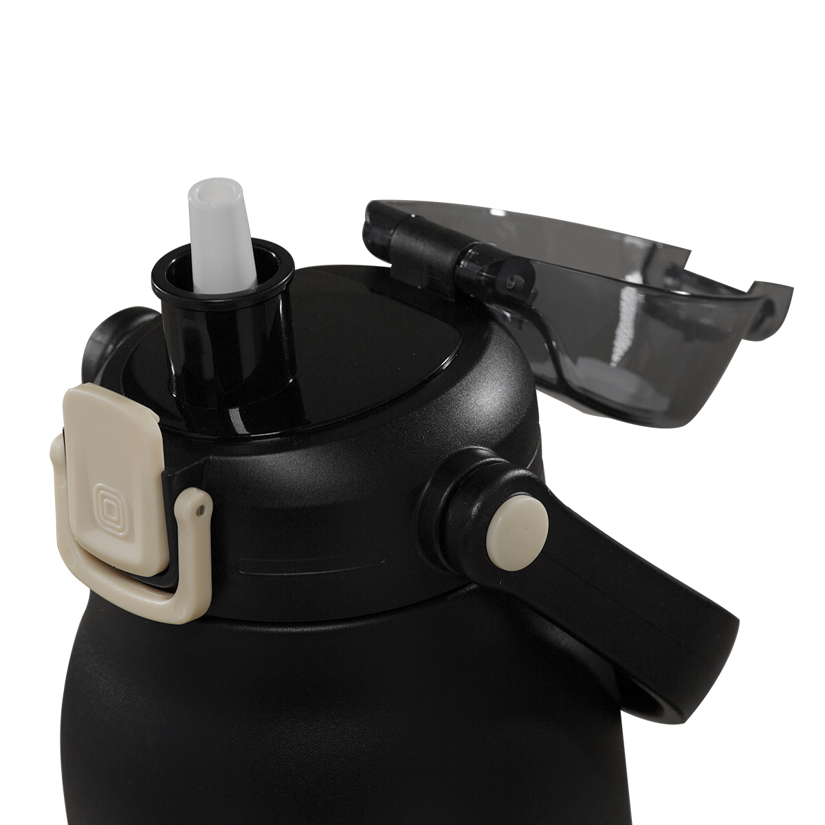 Doble pared. Cerrado al vacío. Pared interna y externa de acero inoxidable. Terminado rugoso. Tapa de plástico con sistema de rosca. Sobretapa con cierre push y seguro antiderrame. Asa plegable incluida. Mantiene temperatura caliente hasta 6 hrs y temperatura fría hasta 12 hrs. Caja individual incluida.