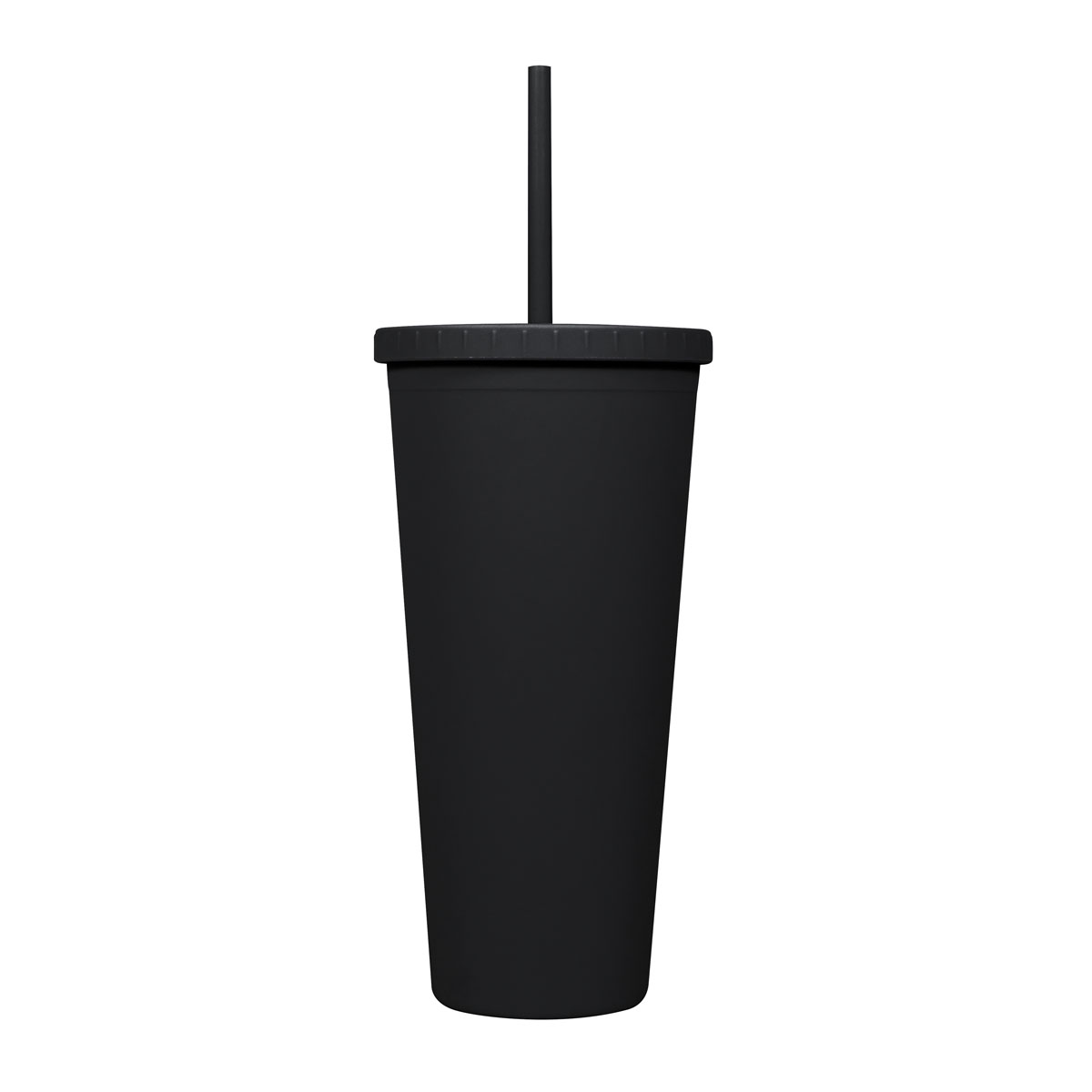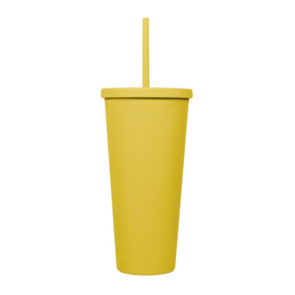Doble pared. Pared interna y externa de plástico. Tapa de plástico con sistema de rosca. Incluye popote. Cuerpo y tapa con terminado tipo rubber. Capacidad 22 Oz. Base de 6.6 cm de diámetro. Caja individual incluida.