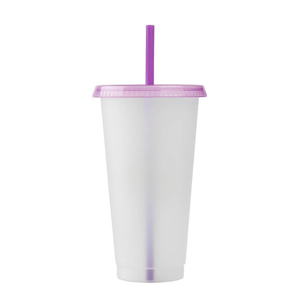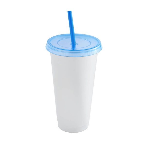 Vaso de plástico de una pared. Añade fantasía y diversión, con este vaso que cambia de color al verter bebidas frías. Su tapa y popote, coinciden con el tono que el vaso revelará al enfriarse, dando como resultado, un conjunto armonioso y divertido. Perfecto para quienes buscan una experiencia refrescante y visualmente atractiva en cada bebida. Capacidad 27 Oz. Base de 6.4 cm.