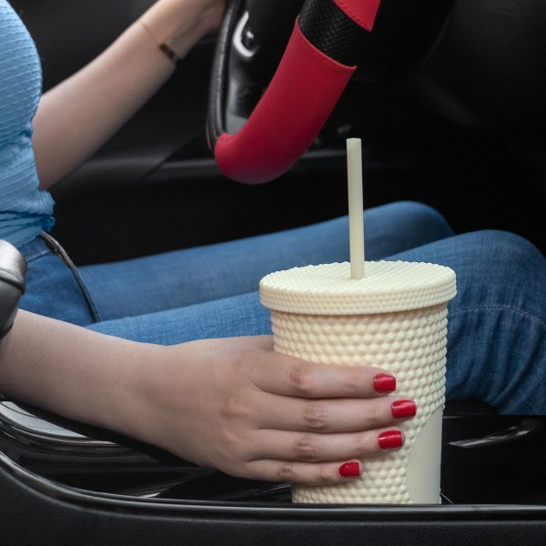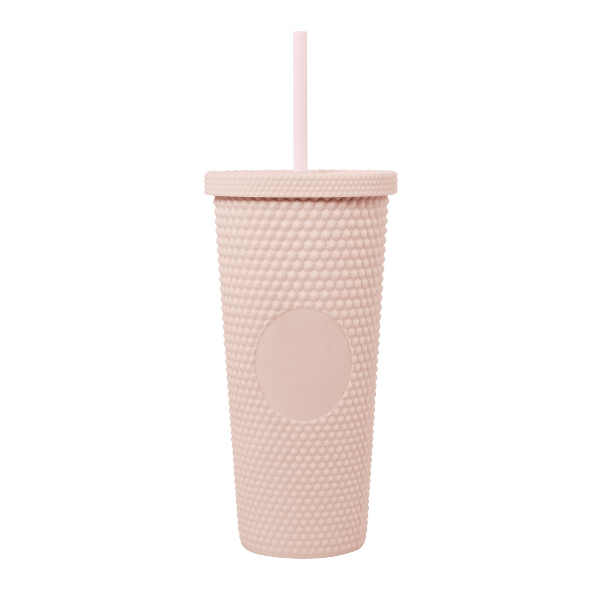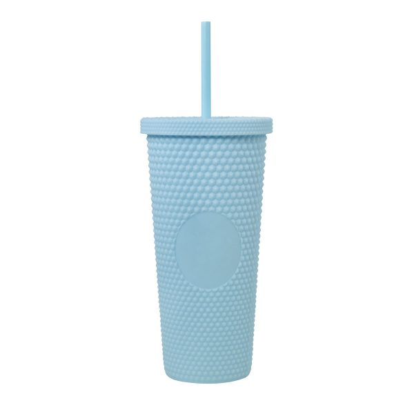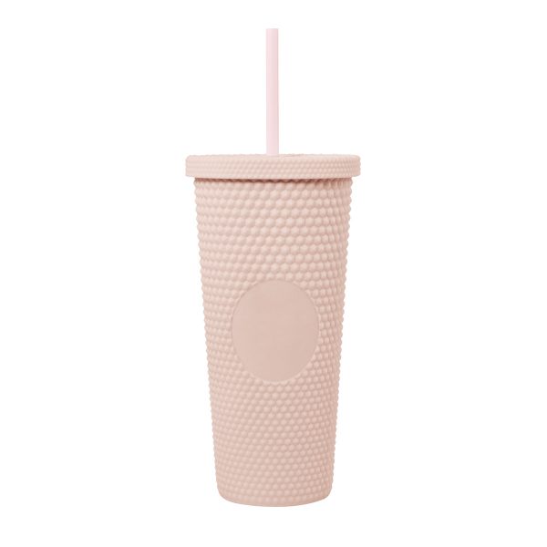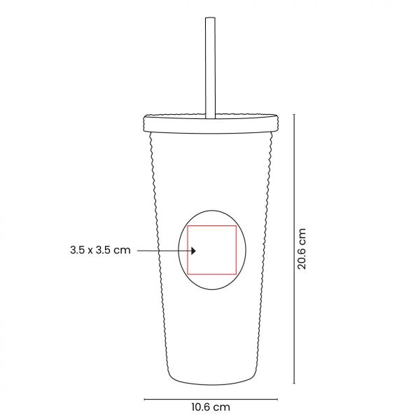 Doble pared. Pared interna y externa de plástico. Tapa de plástico con sistema de rosca. Incluye popote. Cuerpo y tapa con textura diamante y terminado tipo rubber. Capacidad 22 Oz. Base de 6.8 cm de diámetro. Caja individual incluida.