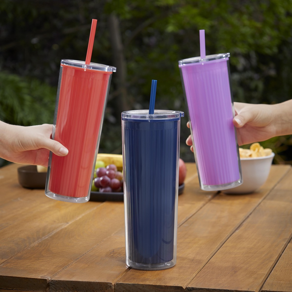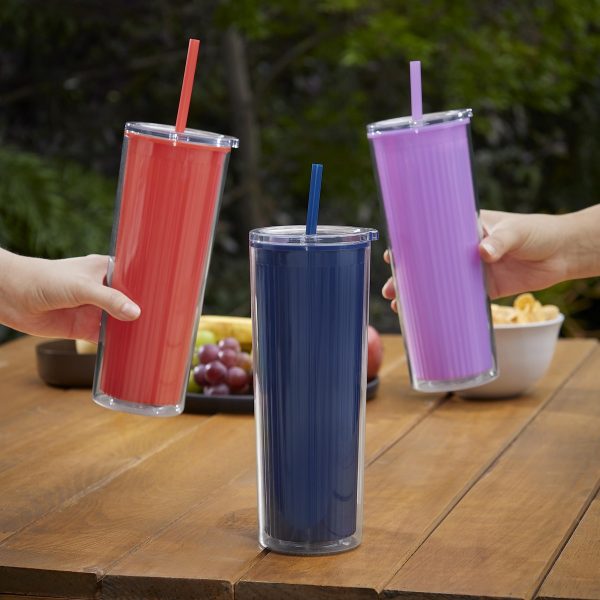 Termo de plástico doble pared. Pared interna de color, texturizada a rayas, y pared externa lisa y transparente que, en conjunto, ofrecen un diseño moderno y vibrante. Incluye tapa de plástico con sistema push y popote a juego. Capacidad de 22 Oz. Base de 7.5 cm de diámetro. Incluye caja individual.